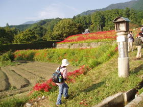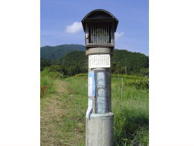 六地蔵から九品寺に至る麓の道を進むと、九品寺の手前あたりに田んぼの間を流れる用水路のそばに、小さな円筒状の塔が建てられています。これが、番水の時計といい、中には時計が置かれていてます。番水の時計により、当番の方が、一定の時刻になると、用水路の水門が開けられる方向を調整し、水の流れを変え、それぞれの田んぼに万遍なく、水が行き渡るように配水を調整をするための慣行を守っているものです。